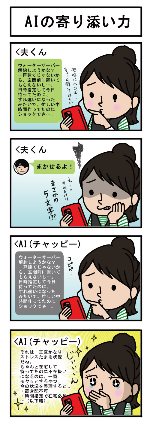 同じ文面に対して、生身じゃないはずのAIの言葉のほうが温かいなんて!まず気持ちに寄り添ってくれた上で、具体的にアドバイスをしてくれるんですよね。夫さん、5文字…(涙)「まかせる」は、こちらの気持ちを立てているつもりかもしれないけど違うんよ…。