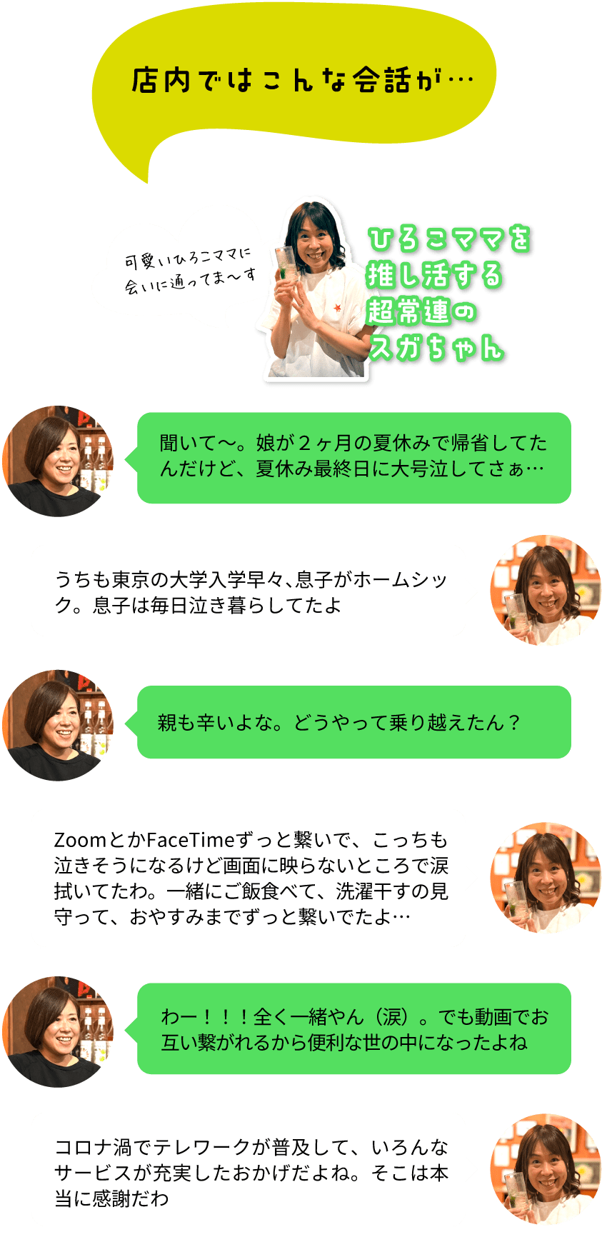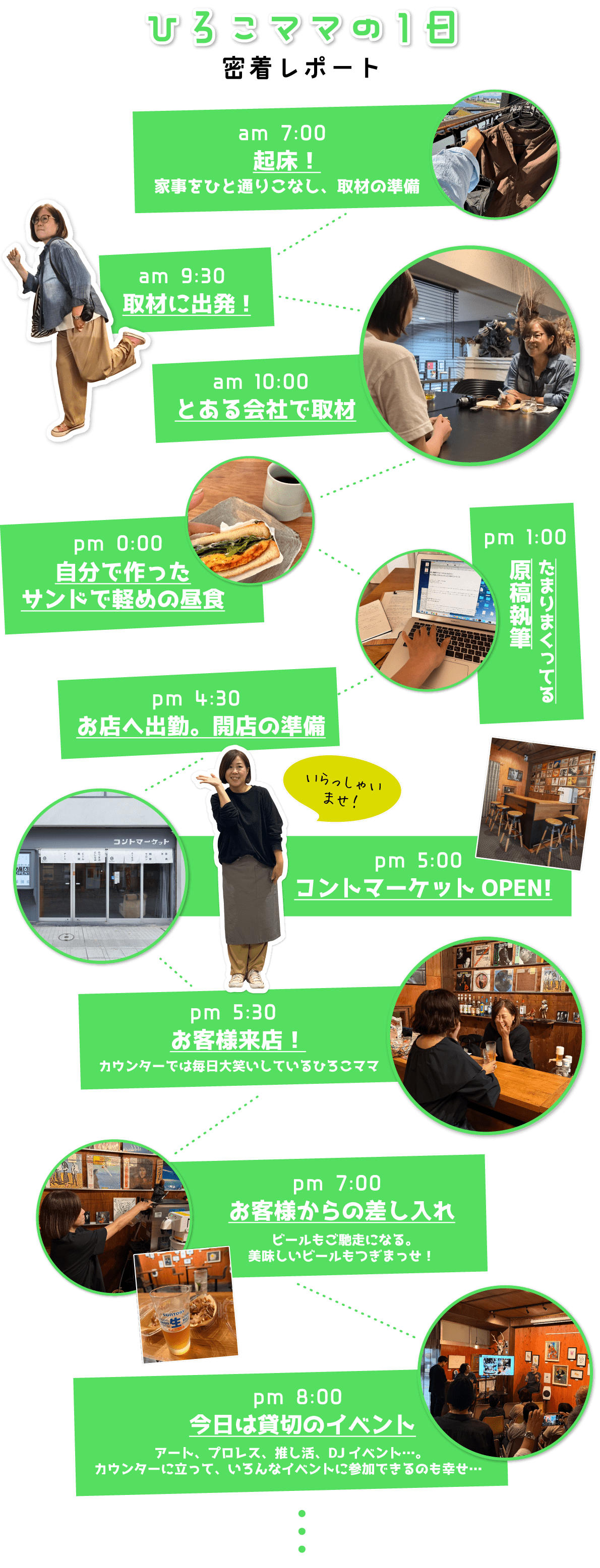 皆さんごきげんよう。ひろこママです。「ママのままプロジェクト」では、唯一の色物コーナーとして(笑)、皆様のお悩みを解決しています。実は私、本業はライターのお仕事をしてまして「ママのままプロジェクト」の専属ライターでもあるんです。今年の春、娘が県外へ巣立ち、空の巣症候群になりそうだった時に新しいお仕事の依頼を受けました。「ママのままプロジェクト」の企画・制作・運営にも関わるデザイン制作会社「コント」さんが新しくオープンしたバーの副店長のお仕事です。そこから私の第二の人生がスタートしました。昼はライター、夜はバーの副店長という二足のわらじを履いて(Wワークやん!と今更気づく)、毎日忙しいけど充実した日々を送っています。「50歳過ぎてからも新しい居場所が見つかるんだ!」「こんな働き方もあるんだ」という皆さんの気づきになれば…と、身を切り売りし(笑)私のとある一日を公開します。