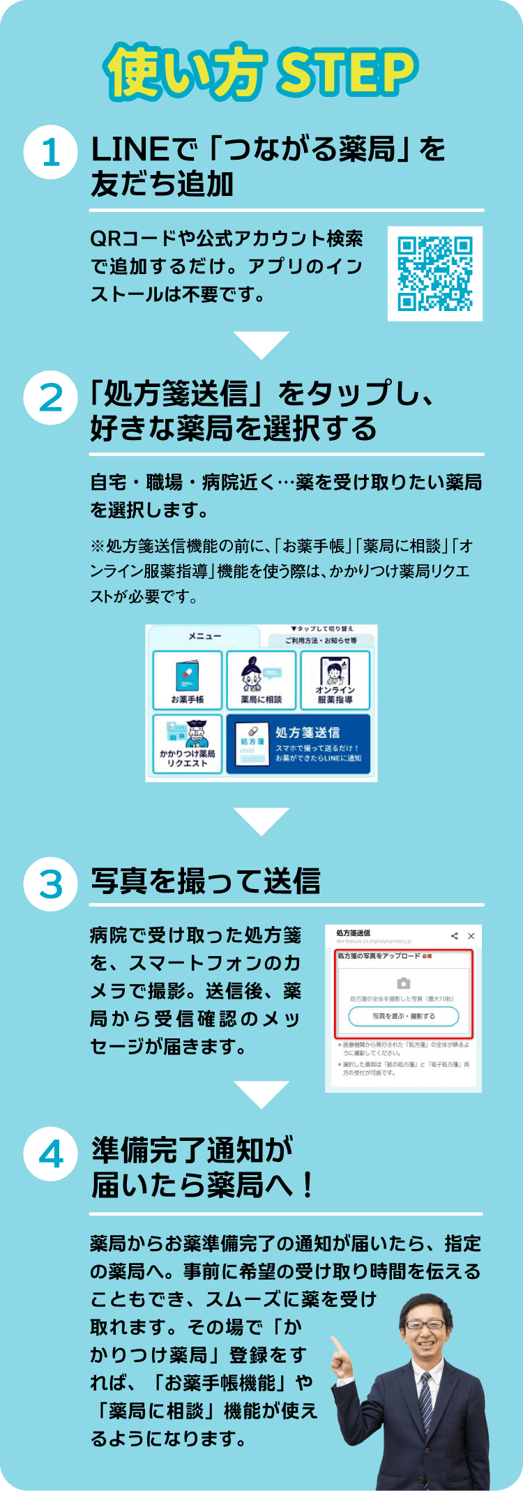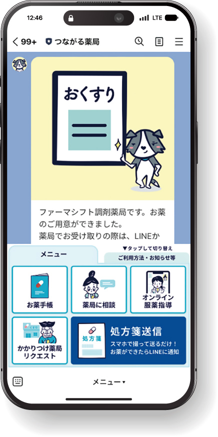 『つながる薬局』は、LINEを使って薬局とつながり、病院で受け取った処方箋をその場で撮って送れる「処方箋送信」、ちょっと気になることをチャットで相談できる「薬局に相談」、お薬情報をまとめて管理・共有できる「お薬手帳」、外出が難しい時にビデオ通話で薬剤師から説明を受けられる「オンライン服薬指導・決済」といった機能が使えるサービスです。