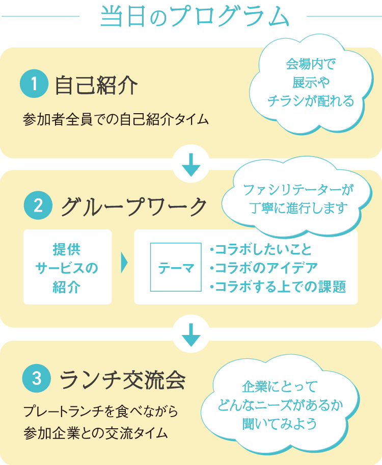 この場での出会いや企業さんとの会話が、活動のヒントになるはずです。