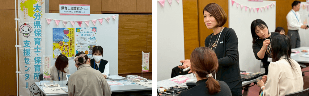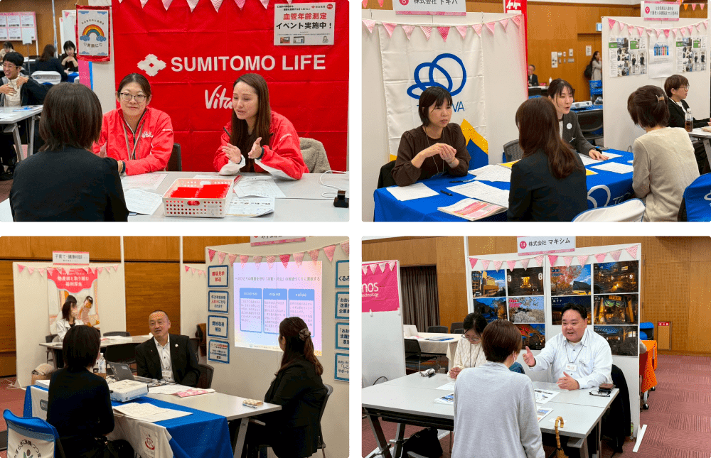 当日は企業ブースのほかに、就活メイクブース、子育て・健康相談ブース、保健士職業紹介ブース、適性診断ブースもあり、就活に役立つ相談ブースが出展。メイクをしてもらったり、子育てや仕事の適性に悩んでいる人たちが悩みを聞いてもらったりと、ブースを訪れることで様々な不安が解消され、参加者の方々も笑顔になっていました。